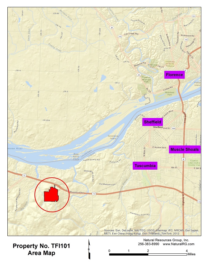 Research Parcel InformationFrom the intersection of Highways 72, 43 and 20 in Tuscumbia, AL, drive west on Highway 72 for 7.25 miles. Cross the median and travel east on HWY 72 a tenth of a mile to the entrance to the easement on the right. Look for Natural Resources Group signs at this point. From this point, use our locator maps to guide you as you travel through these beautiful properties.