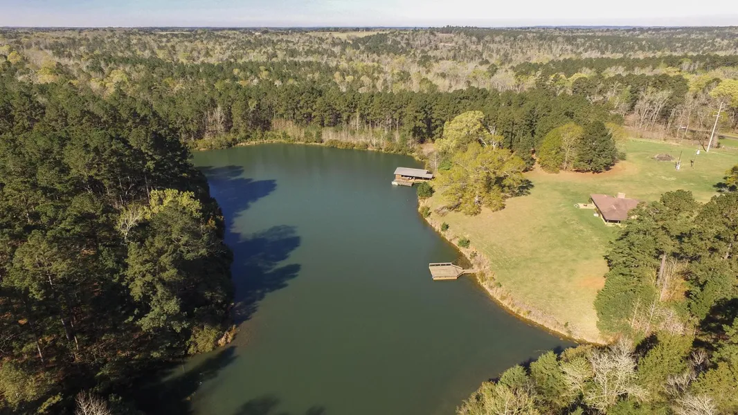 The ultimate private retreat. Recently updated cabin overlooking a pristine 5-acre spring fed lake. 2 piers with covered boat docks, kitchen for cooking your fish right on the pier. Stone outdoor bath house with 4 showers, 3 RV and 5 tent sites with electricity and water. 1,000 sq.ft. metal workshop, 1,200 amp electrical panel, 18-hole frisbee golf course. Additional 1.5 acres spring fed pond that is great duck roost. Abundant wildlife, 5 acres in food plots, 7 two-man deer stands with feeders, 2 tower blinds and one massive ground blind with bunk beds. Beautiful forest of mature hardwoods and pine with 3 miles of ATV trails. Many additional features.