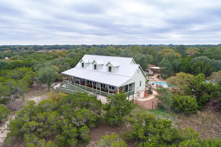 The 4 year old custom designed home offers relaxed living and long 12' deep porches across the front and back and allows for some amazing sunrises in the front and spectacular Texas sunsets in the evening. The pool offers an easy respite from the heat of the summer and overlooks a lovely garden, greenhouse and orchard area that has been lovingly tended by one of the owners who is a Master Gardener and naturalist. A lovely outdoor kitchen and covered gathering space rounds out the amenities near the home and all help to make for a wonderful homey environment. Not far there is an oversized chess set put in for teaching the grandchildren and made for a fun addition. A short walk from there is the Barndominum offering a lovely porch and view with an outdoor shower in addition to the full bath facilities inside. The property is currently wildlife exempt and the current owners have lovingly added paths, watering holes, feeders etc. making this little piece of the Texas Hill Country an amazing oasis. 40 minutes into San Antonio Intl.Airport or 1 hour to Austin; also a private landing area just outside of Blanco, 10 minutes away. FAA Identifier: 3TA5