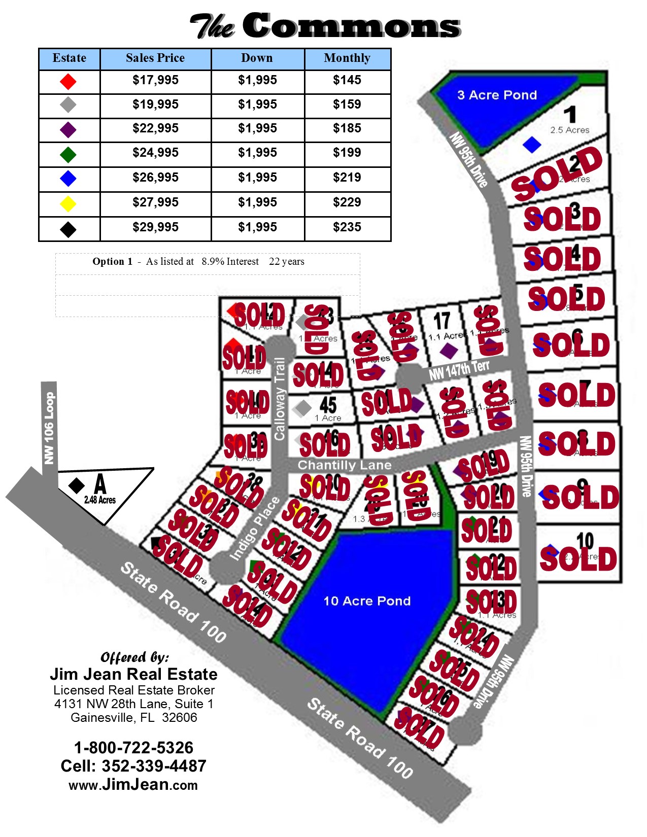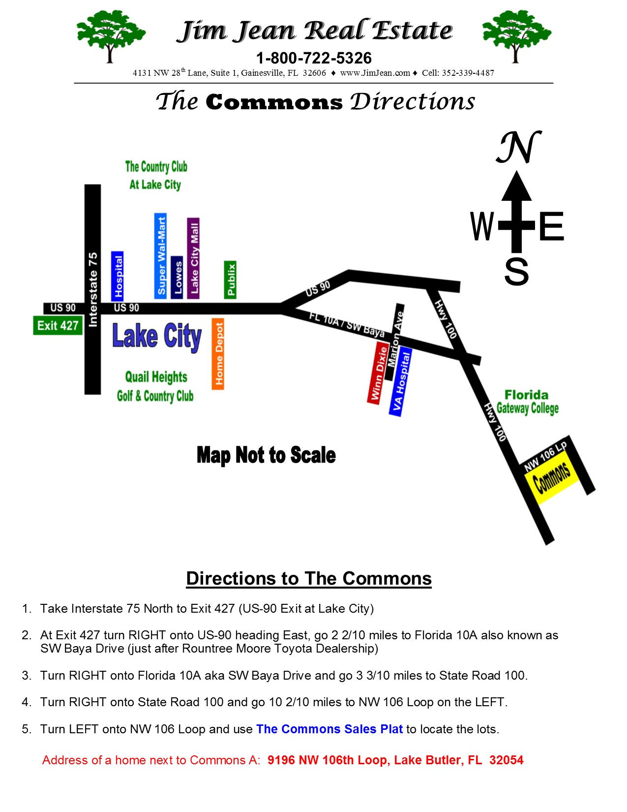 The Commons is located just off State Road 100 about halfway between Lake City and Lake Butler. Here you will find 46 properties ranging in size from 1 to 2 acres. May families already call The Commons home. The lots are mostly cleared with a few trees on each estate. There is plenty of paved road frontage for each location. Electricity is available to the land. For water and sewer you would need to install a well and septic tank.