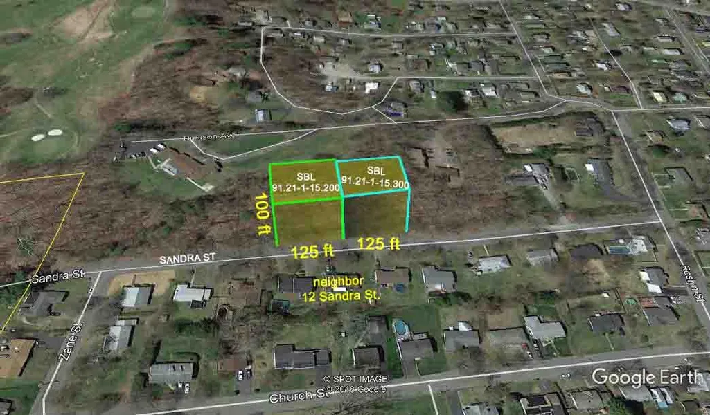 Enter 12 Sandra St., Ellenville, NY 12428 into your GPS. This is my neighbor directly across the street(see map below). Ive placed colored streamers front and rear showing the approx left and right borders of each parcel. I also placed For Sale sign (888) LAND-005 on the properties.