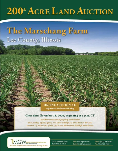 Legal Description: A brief legal description indicates The Marschang Farm is located in part of the Southeast Quarter of Section 17 and Part of the Southwest Quarter of Section 16, Township 20 North - Range 11 East (Lee Center Township), Lee County, Illinois.