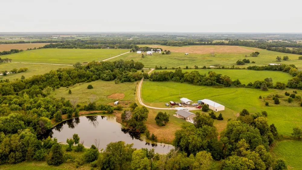 This beautiful 30.9 +/- acre tract located in Parker, Kansas, is full of all the good stuff! The secluded home overlooking the large pond makes this a great setting to live peacefully.