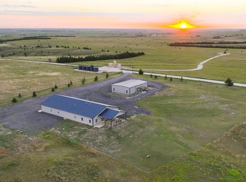 This once-in-a-lifetime opportunity presents an incredible custom hunting lodge spanning approximately 5,000 square feet, situated on nearly 20 acres with breathtaking views of the Western Kansas landscape. Located just 10 minutes from Hays, KS, and the Hays Regional Airport, this 50’ by 100’ lodge is perfectly positioned just 4 miles east of Ellis, KS, offering both convenience and seclusion.Built in 2021, the lodge offers 4,721 square feet of meticulously designed living space featuring eight bedrooms, including five guest rooms with double beds, one guest room with a single bed, and two luxurious master suites, each equipped with full bathrooms, king-sized beds, and bunk bedsideal for accommodating large groups in comfort.The heart of the home is a fully equipped kitchen adorned with high-end stainless steel appliances, elegant wooden cabinetry, and a large barnwood island complemented by rustic barstools. A striking wagon wheel chandelier adds charm and character. The open floor plan flows seamlessly into a spacious living area that includes a sizeable dining room table, a custom bar, and a cozy entertainment room with leather couches and a large flat-screen TV. This entertainment space doubles as a trophy room featuring impressive displays of the current owners’ deer and turkey harvests from the region.Behind a stunning custom sliding barn door lies a long hallway leading to the guest bedrooms and primary suites, as well as a magnificent shower room that boasts three large private showers, three vanities integrated into an extended countertop, and three separate toilet spaces behind locked doors. At the hallway’s end is a washroom complete with washer/dryer hookups and ample storage. Just inside the back door, hunters will appreciate a custom locker room outfitted with organized storage spaces to securely house hunting gear and clothing between excursions. A 16’ by 18’ storage room with a remote-operated overhead door is conveniently located at the northwest corner of the lodge, providing plenty of space for ATVs, UTVs, hunting equipment, and lawn care tools.At the front, a stunning 600 square-foot porch with a solid concrete floor and stylish railing offers a perfect retreat to relax after a long day of hunting while enjoying incredible sunrises with a hot cup of coffee.Whether hosting guests during hunting season, family gatherings, or special events, this exceptional lodge provides ample, high-quality space designed for memorable experiences. Truly one of a kind in this region, Prairie Breeze has enjoyed steady occupancy as an Airbnb rental, attracting hunters as well as families and groups seeking a unique and comfortable retreat. Don’t miss your chance to own this remarkable Western Kansas hunting lodge.- 50’ x 100’ metal lodge- 4,721 square feet of living space- 8 bedrooms- 3 full baths- Spacious dining and entertainment area- Modern rustic kitchen with stainless steel appliances- Large bathroom with triple shower, vanities, and toilets- Enclosed patio (18 ft x 24 ft) with open fire pit, outdoor furnishings, and wood pellet grill- Locker room with 8 separate lockers for hunting gear, etc.- Central heat and air- Water well and septic system- 600 sq ft concrete porch with incredible views- 16’ x 18’ storage garage- Fully furnished- Two pond sites located South and West of the lodgeLODGEKEEPER’S QUARTERSThe secondary building on the property is a large metal-constructed building with a 1,120 sq ft garage with sufficient space for parking vehicles and storing equipment. It also serves as a small dog kennel. The West half of this building is a 1,280 sq ft living space currently occupied by the property manager, who is willing to continue her role maintaining and managing the lodge for the new owner. This living area consists of 2 bedrooms, 1 full bath, and a pleasant open kitchen and living space. The kitchen features plentiful counter space and a beautiful island with a cutting board-style top. The living space within this building features beautiful dcor and wall colorations, providing a high-quality additional living space.- 1,280 sq ft of beautiful living space- 2 bedroom- 1 full bath- 1,120 sq ft garage- 2-car garage capacity- Built in 2021- Central heating & air- Water well & septic- Rock fire pit in the frontThis incredible lodge property is located less than 8 miles from Hays, KS, and only 10 miles from the Hays Regional Airport!Contact the listing agents Adam Hann (785.259.2469) or Mitch Keeley (785.259.0492) to schedule a full tour of the lodge today!