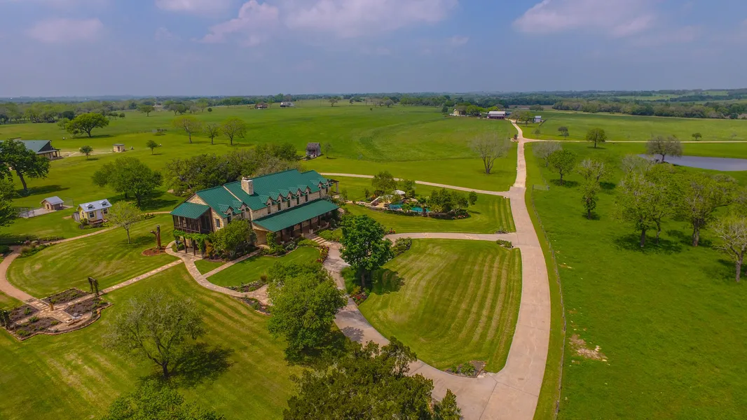 The ranch boasts a distinguished 2-story, 4-bedroom, 4- bathroom Austin stone main lodge, built on a scenic hill overlooking a large lake, with luxurious accommodations and expansive spaces for entertaining. The layout features a large master suite, 3 additional guest rooms 2 of which include en suite baths an executive office, private balconies and abundant covered porches, including an expansive fully screened back patio/porch. The interior of the lodge is highlighted with stained concrete floors, vaulted 2-story ceilings, exposed stone walls with an exceptionally grand fireplace, gourmet island kitchen with granite countertops, ice maker and upscale appliances, which include 2 dishwashers, all enhanced by refined rustic dcor and furnishings. The first floor also features a full wet bar with sink, ice maker and roomy refrigerated drawers. The area immediately surrounding the lodge is exceptionally beautiful, with lush lawns and landscaping, a waterfall pool and spa, covered outdoor kitchen and spacious cantina bar and dining area, a lovely, plotted varietal rose garden, a shady meditation garden serenaded by a splashing water feature, a charming, perfectly scaled playhouse delightful for any mini-chef, a rustic just-for-fun log cabin for camping out, a stone fire ring and a 5-car garage with exceptional storage cabinetry, topped with a charming upstairs casita apartment.