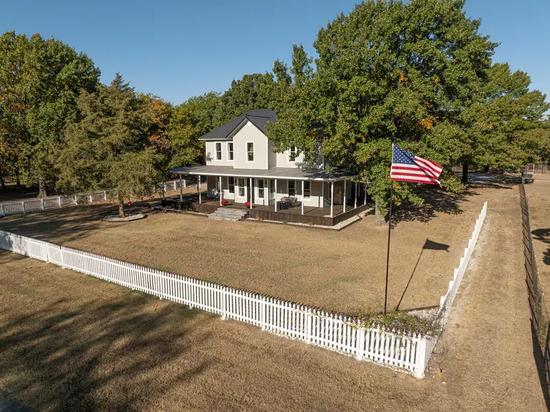 Welcome to your dream 42-acre horse ranch, a stunning blend of rustic charm and modern comfort. This property features a spacious 6-stall barn complete with paddocks, perfect for equestrian enthusiasts. The home is a beautifully crafted historic replica of the iconic Lonesome Dove and Silverado, offering 3 bedrooms and 2.5 baths. Recently painted with a new roof, it boasts a covered wrap-around porch that invites you to relax and enjoy the serene surroundings. Inside, you'll find extra soft new carpeting with a 3-year warranty and elegant tile flooring throughout. The home has so much character! With 12' ceilings, and all the, extra long windows throughout each room lets in additional natural light to give you the feeling of being right out in the middle of the ranch! A wood burning stove, making it move-in ready. With new heat and air units, you'll stay comfortable year-round. The property showcases new landscaping, enhancing its natural beauty. Additional features include newly stained barn , a gated entrance for added privacy, and a 50 x 80 shop with lean tos on 3 sides, a concrete floor, ideal for storage or projects. The 60 x 100 red iron arena or use for a hay barn, provides ample space for your equipment and Hay. The land is fully fenced and cross-fenced, ensuring safety for your animals, along with a chicken coop and dog kennels for your furry friends. Wildlife enthusiasts will appreciate the abundant deer and wildlife that roam the area. Located just 1/2 mile from Lake Hudson, this ranch offers both tranquility and adventure. The blacktop driveway leads you to this hidden gem, complete with a gated entrance for privacy. Experience the perfect blend of country living and modern amenities at this remarkable horse ranch! There is a also an RV hook up by the hay barn as well as cattle corrals.