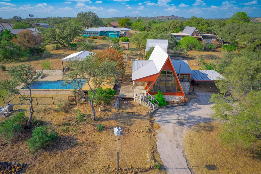 Unique A-frame home with 3 bedrooms and 1 bath. Living room features a wall of windows with tongue and groove walls. Nice kitchen with stainless appliances and granite counters. All bedrooms are on the main level. A spiral staircase leads upstairs to a loft area. The property also includes a 675 SF, 1 bedroom, 1 bath guest house with an extended slab that would allow you to expand easily. Outdoor entertaining is a breeze with an in-ground pool and pavilion with outdoor kitchen. Sitting on 1.4 acres with lake views, this is the perfect lake house getaway!