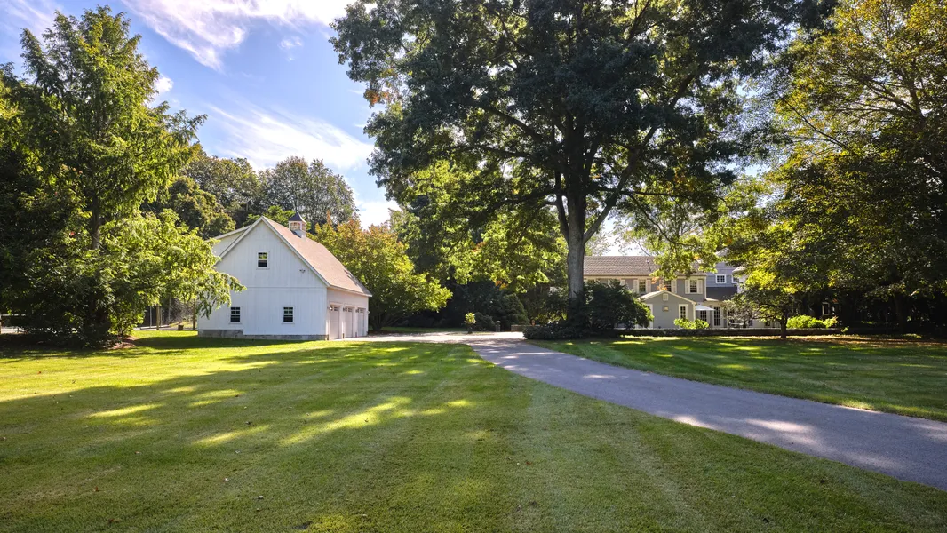 This remarkable Essex country estate is sited on a quiet lane in close proximity to the Village and on a cul-de-sac with deeded access to Middle Cove. Approaching the residence down a long, curved driveway surrounded by sweeping lawns, you are introduced to the almost two acre parcel of beautifully landscaped property interspersed with specimen plantings, mature gardens and shade trees, as well as a Har-Tru tennis court and a stunning, three bay Carriage Barn, with potential living space above. The architecturally distinctive home with its unique silo, is surrounded by pea stone terraces that welcome outdoor entertaining and relaxing. The interior features the heart of the house...a stunning Chef's kitchen, with polished concrete flooring always warm underfoot with radiant heat, is highlighted by a cozy and relaxing retreat tucked into the dramatic silo and doors leading out to the terraces, The ship lap clad family room with wet bar is perfect for casual entertaining, and an additional smaller family room is available for quiet family gatherings. The fabulous living room is perfect for both formal and informal events with French doors leading to an additional stone terrace. On the second level is the dramatic primary suite with its own study, dressing room and luxurious bath - an intimate escape from the world. An additional four bedrooms, including a main floor suite, and three baths provide for all your family and guests.