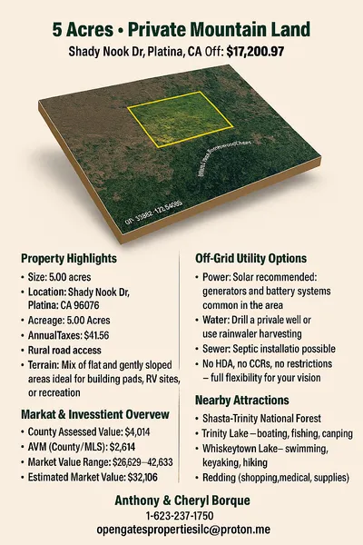 This expansive Three 5 acre parcels offers a rare opportunity to own private, peaceful land either all or just one lot in the mountains of Shasta County. Ideal for off grid living, recreational use, or long term investment, the property provides a blend of natural beauty, privacy, and strong value growth potential.