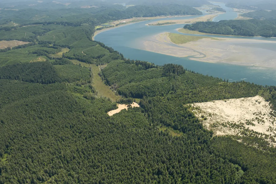 This 146 acre Three Mile Creek timber and recreation property, containing two contiguous tax parcels of 115 and 31 acres, is located by Oregon Dunes National Recreation Area along Oregons southern coast, between resort communities of Florence and Winchester Bay. There is year-round access to Highway 101, located 2.3 miles east. It is one of the only private inholdings within Oregon Dunes National Recreation Area, which is part of the Siuslaw National Forest. Sparrow Park Road, which connects to Highway 101, bisects Auction Property 107 and continues one mile west to the beach, as well as providing access to the trailhead to Three Mile Lake. Three Mile Creek, an important coastal stream, runs through Auction Property 107 and contains a high quality wetland and riparian area with beaver pond and meadow. Auction Property 108 has one quarter mile of steep Umpqua River frontage and spectacular views of the river, Winchester Bay, and Pacific Ocean. Access to Auction Property 108 is from a logging road spur through adjoining Siuslaw National Forest land.