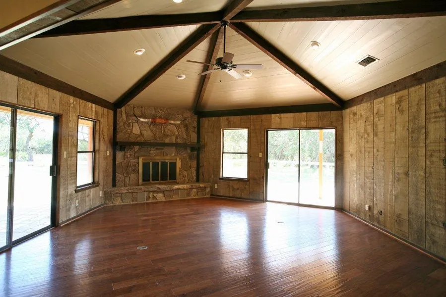 Freshly updated Hill Country rock home with granite counter tops, wood floors, wood burning fireplace and metal roof nestled on 19.28 acres in Tierra Linda Ranch, the ranch consists of 3,000 acres, a 3,000' paved airstrip, 2 lighted tennis courts, clubhouse, adult and kiddie swimming pools,there are horses available for your riding pleasure and 260 acres of parklands, including lakes for fishing. Ag exempt.