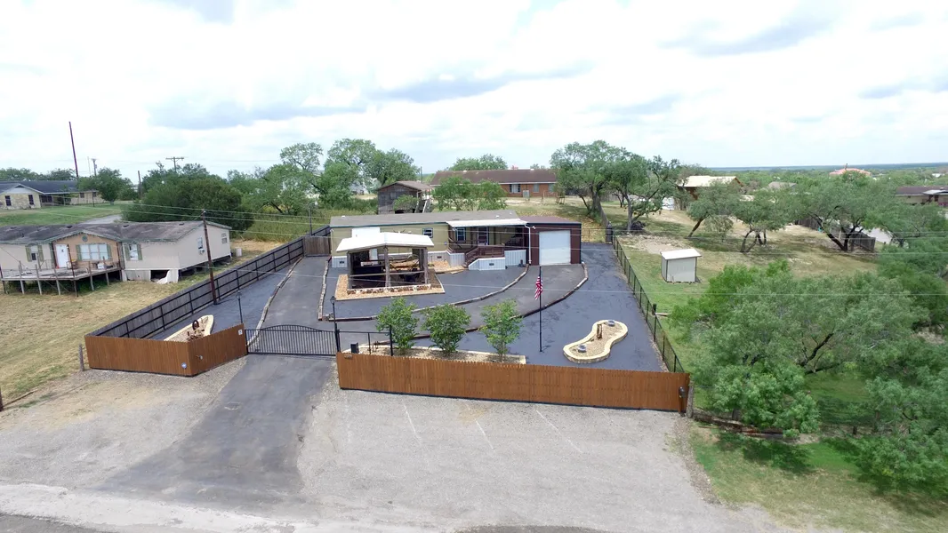 Low maintenance and built to entertain; this 2 bedroom 2 bath home in Tilden, TX is a perfect place to call home, but could also serve as an excellent place for a business to own as a centralized office/storage/meeting locale. The property has a large covered outdoor kitchen and patio with concrete bar, built-in smoker, microwave, fryer, sink, TV, and open seating area configured to take advantage of the prevailing breeze. There is also a nice covered deck that welcomes you into the "Cabin in the woods" like home.