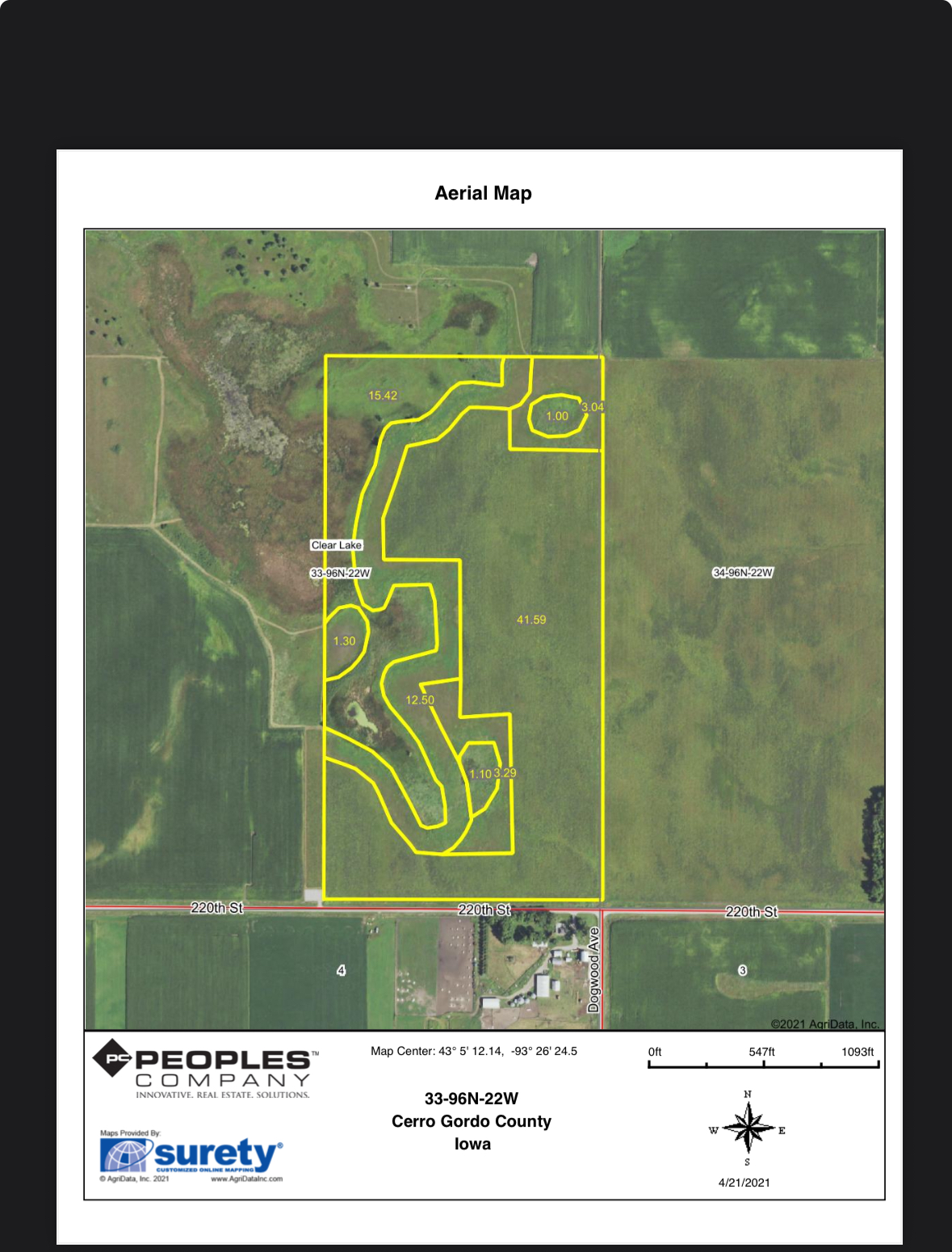 Research Parcel InformationIf you drive south out of Ventura on balsam ave, you go a couple miles until you get to 220th. Go east on 220th 1 3/4 mile and you’ll see a big sign in the field driveway on north side of road. On the west side of this farm is blue ring marsh. On the east side is a farm that was just pattern tiled so it’s easy to tell where that farm begins