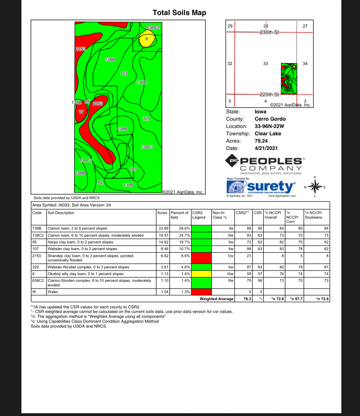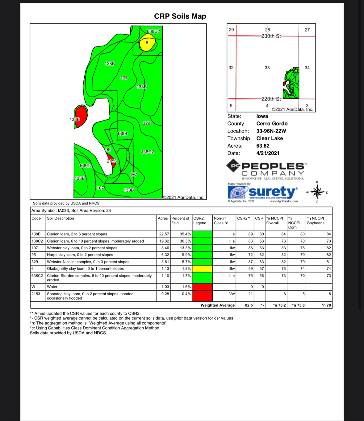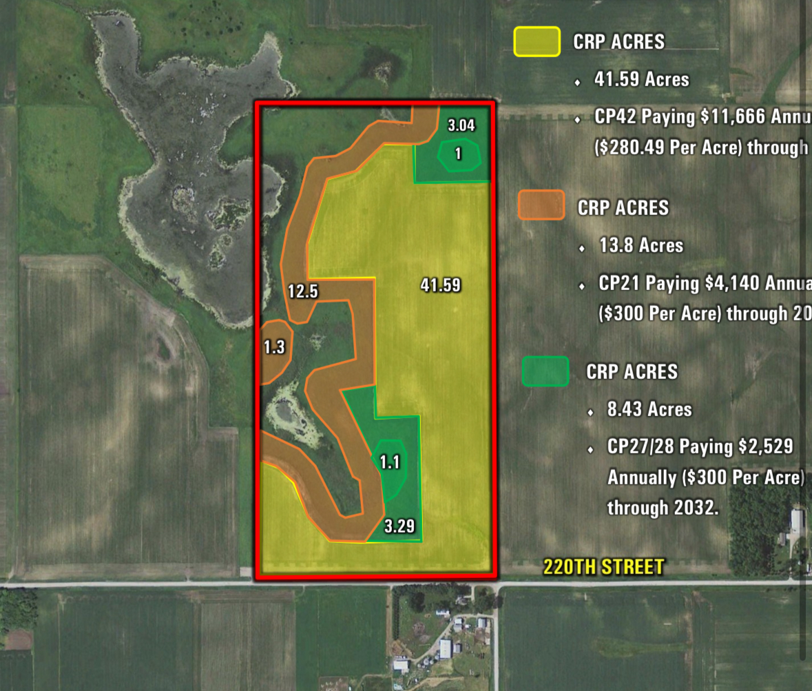 80 acres for sale south of clear lake. 82.5 csr2 on the tillable and crp. 76.3 crp2 on the overall acres. 41.59 acres tillable for 2026 season. 22.23 acres of crp coming out in 2032 at $300/acre annual payment. 15 acres of non tillable land. Located on 220th, 1 3/4 mile to the west of balsam ave. Signs are up!