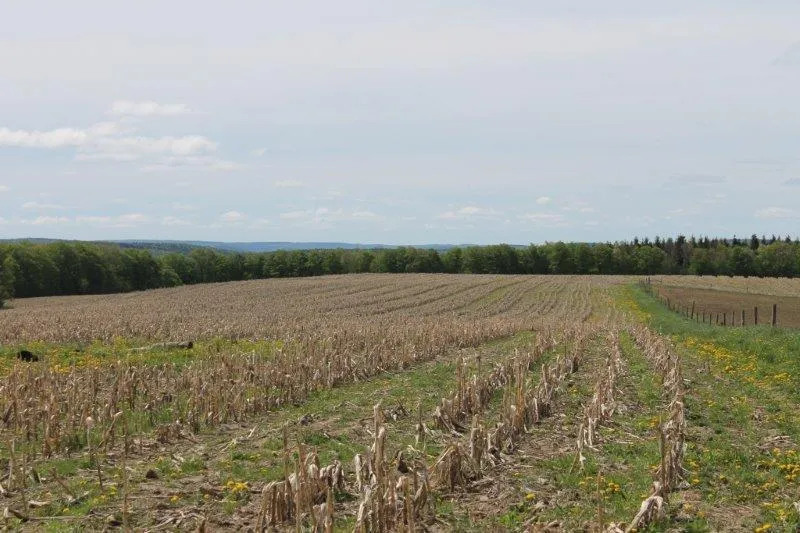 Farmland in DeRuyter NY with fencing for cattle and borders State Forest.
