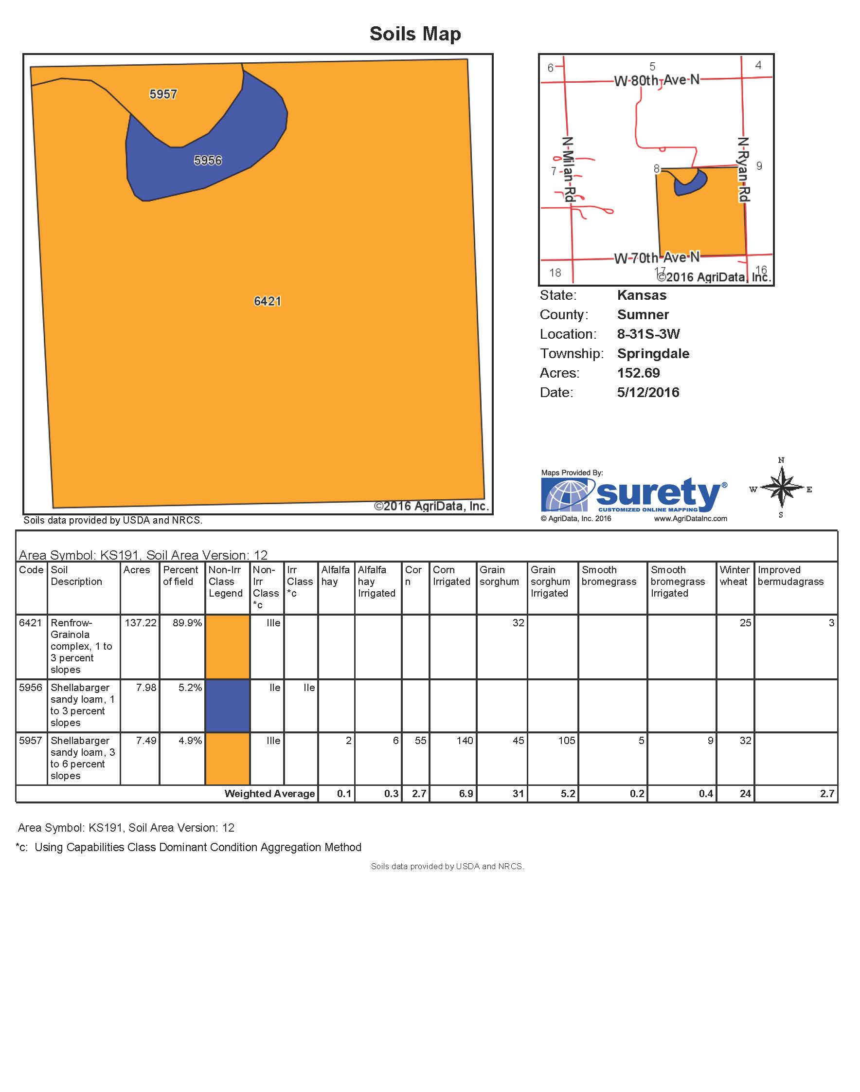 SOIL TYPE: Approx 90% Renfrow-Grainola complex (1-3% slopes), balance Shellabarger sandy loam (1-3% and 3-6% slopes)
