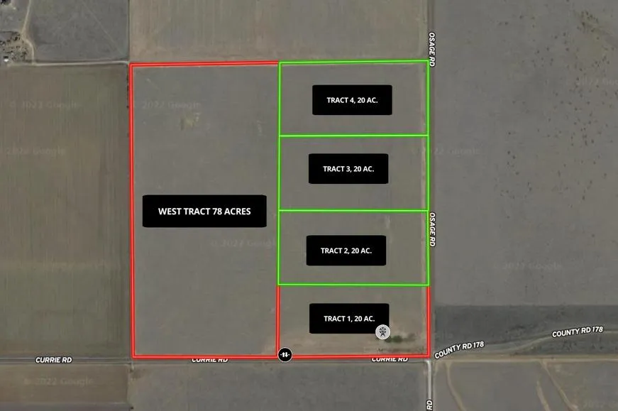 From Amarillo, take exit FM 1541/Washinton St south for 7.4 miles, continue on E Country Club Rd, take Tradewind St to Currie Rd/Hugh Currie Rd for 2.8 miles, turn left onto E County Club Rd, after 1 mile turn left onto Tradewind St, Tradewind St turns right and becomes Currie Rd/Hugh Currie Rd. The gate to the property will be in the middle of the tracts on Currie Rd.