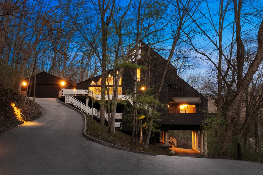 Fall in love with this timeless and modern masterpiece, perched among the trees on 1 acre in Sugar Creek Nature Preserve. With its multiple decks, this home offers an ever-evolving indoor-outdoor living experience. The kitchen features black marble countertops & backsplash, a huge picture window, custom cabinets & a spacious pantry. Marble flooring flows from the kitchen to the adjoining dining room with a vaulted ceiling, wall of windows & access to the upper deck. The primary suite offers wooded views and features a bath with a marble dual vanity, abundant closet space, and access to a deck. The sunken living room is flooded with light and leads to multiple indoor & outdoor living spaces. The upper-level guest suites, each with an adjoining sitting area & multiple closets, share an updated full bathroom with dual vanities. 4th bedroom with en-suite bath. Minutes to downtown Kirkwood, restaurants, & the farmers market walk to Kirkwood Park.