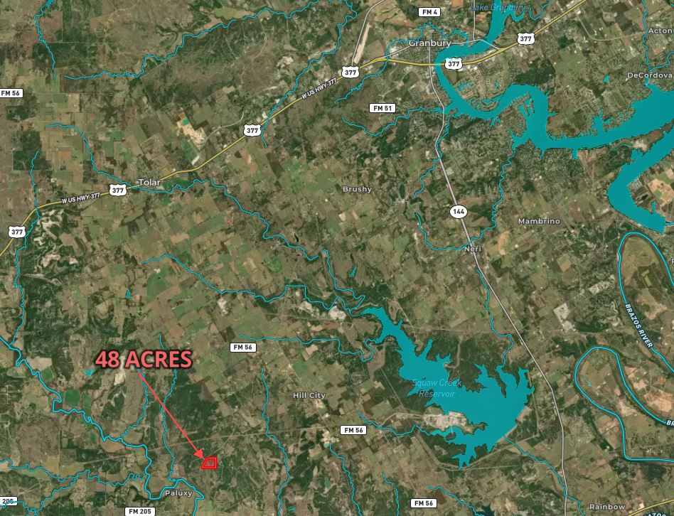 48 Acres with stunning Hill Country like views. This rare, hard to find and gorgeous tract of land is just minutes from the Paluxy River, just ten minutes from all the shopping and dinning in Granbury and situated in highly accredited Tolar Independent School District. Scatted throughout and in abundance are a variety of mature trees to include live and red oak tress, elm, cedar and mesquite. There are a multitude of home building spots with or without the stunning views which would make this property ideal for recreational, farm and ranch, development or the perfect place to build and maintain your next mid size ranch. This property is rarely touched and there is a seasonal creek running through which makes for an attraction of an abundance of native wildlife to include white tail deer, turkey, feral hogs, dove and all kinds of non-game species. Just 9-10 Minutes from Granbury.