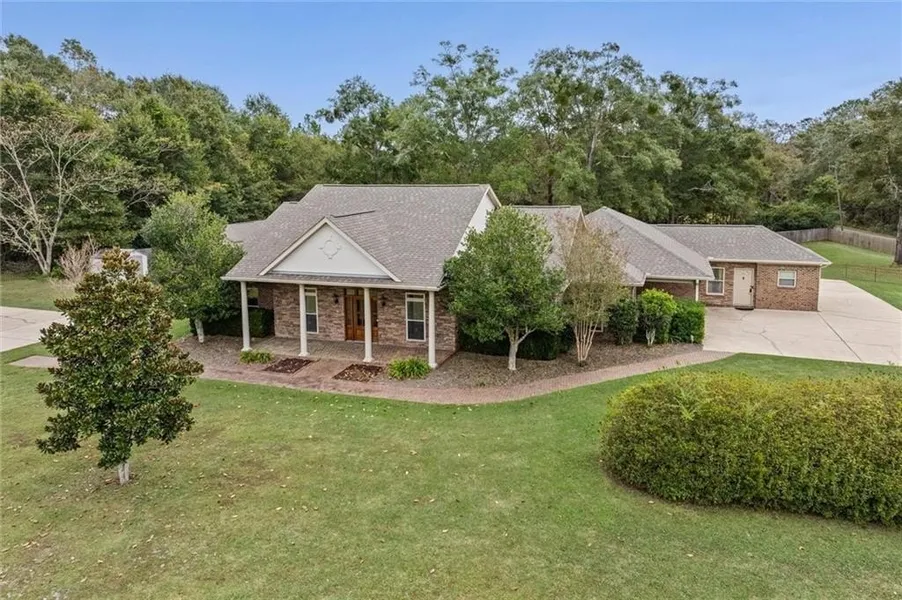 This beautiful custom built one owner home boats a wonderful in-law suite with bedroom, living room, private bathroom, walk-in closets, and kitchen. It is accessible to main space and to a private entrance. The home has wonderful crown molding throughout, tray and double tray ceilings, smooth ceilings, wood blinds, and custom paint. The gourmet kitchen has a granite island with a hand washing sink, double oven, 5-burner gas cooktop, sunny breakfast room, lots of custom cabinets, and a walk-in pantry. The formal dining room is off the inviting foyer and adjoins the spacious family room open to the living area. Sparkling in ground Gunite saltwater pool with decorative stone surround, built in steps, and cleaning filter system. Roof was replaced in 2020, both refrigerators in 2021, both microwaves in 2022, and main house AC in 2021. WHOLE HOUSE GENERATOR was installed in 2022. There are 2 tankless gas water heaters. (All dates per owner). Septic tank was pumped and inspected in 2019. This tastefully decorated home has all the bells and whistles you'll ever need. 10 minutes to the University of Mobile, and 7 minutes to downtown Semmes. It is now annexed into Semmes. Buyer responsible for verifying all measurements and relevant details.