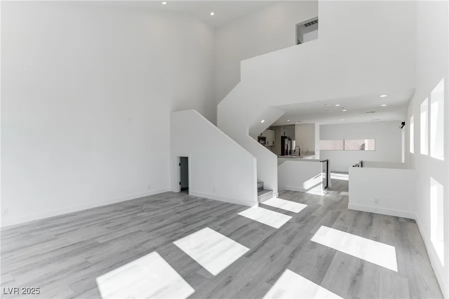 Discover this stunning loft-style townhome in the heart of Downtown! Spanning three levels, this home features a private yard, attached two-car garage, and modern design throughout. The first floor offers a bedroom, full bath, and versatile den with sleek concrete flooring. On the second floor, enjoy an open-concept kitchen, dining area, and living room with soaring vaulted ceilings, abundant natural light, and access to a private balcony. The top floor boasts a spacious primary suite with dual sinks and a large walk-in shower. Plus, take in breathtaking Strip and city views from both the second and third floors!