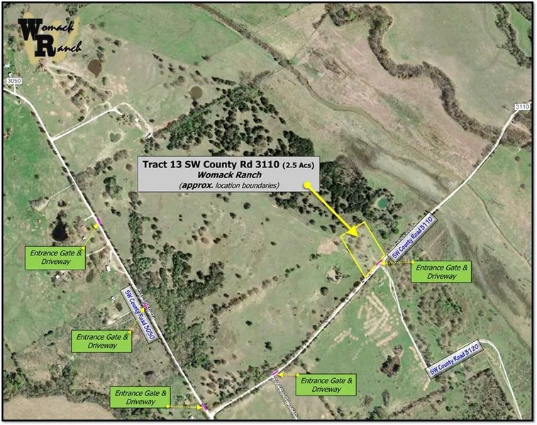 A New Place to Call Home! Tract 13 is a 2.5 acre tract in the brand new subdivision of Womack Ranch. Pasture area, existing holding pens, trees, open building areas, existing water meter, entrance gate and drive already on tract. Plenty of deer & other wildlife plus hunting is allowed. Womack Ranch is a brand new subdivision south of Corsicana. Deed restricted to site built homes with a minimum of 1,100 sq ft. Barndominiums welcome! Horses & cattle welcome on at least two acres of land. Utilities at road & owner will pay to run electric above ground along lot line up to 150' & another 65' underground into tract~with normal application fees.