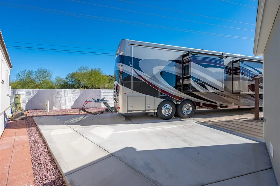 Features include upgraded concrete for wide turns and abundant parking, decorative paver-lined driveway, custom pergola with Coolaroo roll-down shades, and a large 10x12 Tuff Shed with power—perfect for golf cart parking and charging. Shed includes 120V power with a 4-plug outlet, plus both 50-amp and 30-amp RV hookups at the pedestal for maximum convenience.