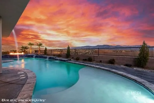 Experience resort-style living with mountain views, a large pool featuring a rooftop waterfall, infinity spa, fire pit, shuffleboard, outdoor kitchen, and a spacious covered patio equipped with two TVs, speakers in the ceiling and landscaping outside and interior speakers too. The home includes a 15'5"x44' RV garage with a 12x14' door, a 30' deep two-car garage, and a theater room with seven luxury chairs and a large screen(chairs included). The kitchen features a farmhouse sink, upgraded Cabinets, Quartz countertops, and a smart refrigerator you can check remotely on an App, along with a gas range, stainless hood, and double wall ovens. Additional highlights are a gas fireplace, soft water and R/O systems, a 500-gallon buried propane tank, remote-controlled blinds, epoxy garage flooring, an extensive security system, and all TVs are included. This four-bedroom home offers 14 foot ceilin...