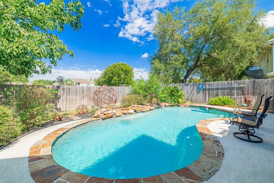 Stunning 2-story, 4-bedroom, 2.5-bath home with a 2-car garage, beautifully updated throughout. The tiled entry opens to a formal dining room with wood flooring. A spacious family room offers soaring ceilings, wood floors, and a cozy corner gas-log fireplace. The updated kitchen boasts quartz counters, gas cooking, pot filler, tile flooring, and a bright breakfast nook. Retreat to the elegant primary suite with a spa-like bath featuring dual sinks, a soaking tub, and a separate walk-in shower. Upstairs includes 3 secondary bedrooms and a full bath. Step outside to your private backyard oasis with a sparkling pool and waterfall, cool deck, mature trees, and covered patio—plus no back neighbors! Additional highlights: Generac Whole Home Generator, recent roof, sprinkler system, and convenient access to major highways, shopping, and schools.
