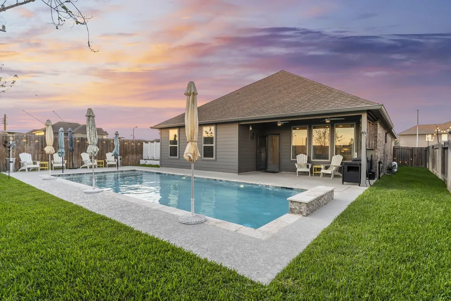 The thoughtfully designed backyard is a standout, offering a gunite pool with baja shelf surrounded by travertine and ample Cool TM decking, two water features and an upgraded heater for year-round enjoyment. A large covered porch, additional patio space and a versatile fenced outdoor area ideal for gardening, play space, or pet run make the backyard as functional as it is relaxing.
