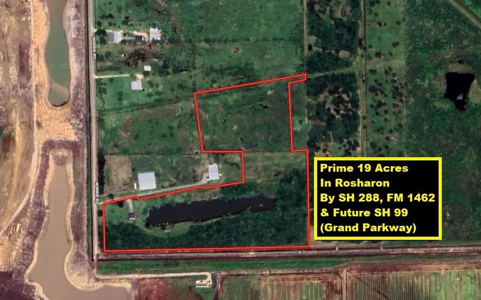 Incredible opportunity! 19 acres on Norris Road in Rosharon by SH 288 & FM 1462. Perfect for your dream ranch, custom home, or future development. Located in a growing area of Brazoria County, with easy access to SH 288 and amenities in Houston, Pearland, and Manvel. This property offers a peaceful, rural setting and is a good investment for the future. Its size and location next to the new Preservation Creek community make it highly attractive for long-term development potential. The property has 312 feet of frontage on Norris Road. The 1700+ square foot home on the property features a deck overlooking the beautiful lake. While the home is livable, it needs significant updating. The land itself holds the most value. The 9-acre parcel adjacent to this land is leased to Rainbow of Hope, a non-profit equine therapy group. Invest in Texas land with endless potential!