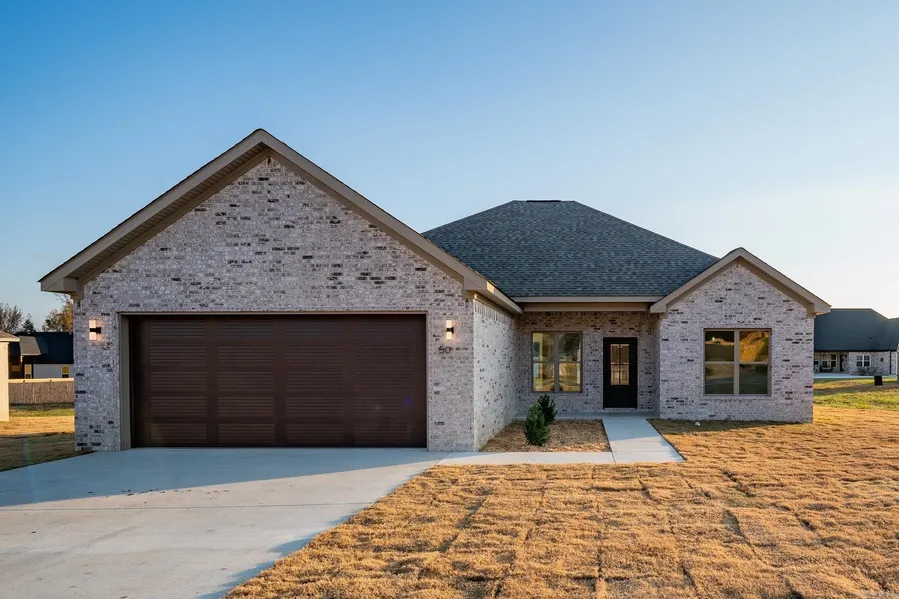 Beautiful New Construction in Vilonia’s newest subdivision! This all-brick build showcases Coretec luxury vinyl plank flooring throughout, quartz countertops, and a stylish electric fireplace. The open kitchen offers abundant cabinet space, a large peninsula, and Delta fixtures. A split floor plan provides privacy, while the primary suite features a sleek walk-in shower, relaxing soaker tub, and dual vanities. Enjoy a covered back patio overlooking the spacious backyard—perfect for entertaining or relaxing.
