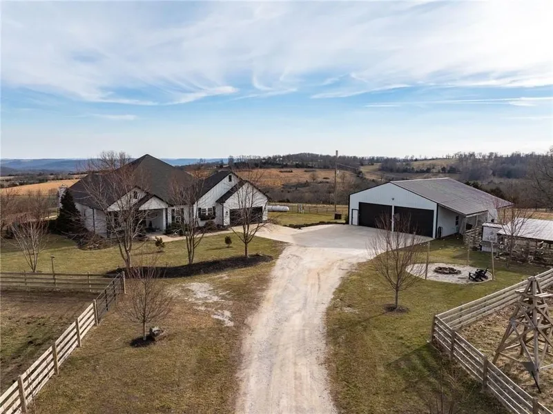 Perched atop a hill in a private, remote setting, this stunning modern farmhouse offers expansive views with unforgettable sunrises and sunsets. Built in 2018, the 3,450 sq ft home features 4 bedrooms and 2.5 baths and includes 20 acres. The kitchen is designed for both beauty and function with granite and butcher block countertops, soft-close cabinetry with custom slide-outs, pantry, farmhouse sink, pot filler, and double oven. The spacious primary suite showcases shiplap accent walls, a large custom tile shower, soaking tub, and a walk-through closet that connects directly to the laundry room. The laundry room includes a sink and abundant storage. Oversized sunroom featuring a gas log fireplace & mini-split system. Outdoor enthusiasts will appreciate the proximity to the Buffalo River and popular hiking destinations including Hemmed-In Hollow, Hawksbill Crag, Lost Valley, & Centerpoint Trailhead. Wired for a generator and has a whole home surge protector. 40x 50 shop building, chicken coop and room for animals.