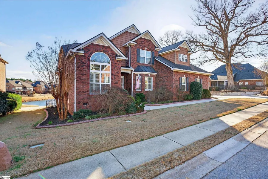 Located in the highly sought after Riverside school district, wake up to water views, flowing fountains, and the quiet soundtrack of ducks gliding across the pond. At 205 Gladstone Way, mornings begin with coffee on the deck overlooking one of the highly desirable and gated Riverwood Farm’s most scenic waterfront settings. This refined brick home blends elegance, comfort, and lifestyle in a setting that feels both peaceful and connected. Offering over 3,100 square feet, this 6 bedroom, 4 bath home features 9+ foot ceilings throughout and beautifully refinished hardwood floors on the main level. This home features a functional central vacuum system you don't find often! The living room is filled with natural light, highlighted by dramatic vaulted ceilings and a gas log fireplace. The dining room showcases timeless plantation shutters, while the kitchen is well appointed with a gas range, granite countertops, quality cabinetry, and a spacious pantry ideal for hosting. The primary suite is located on the main level and features a vaulted ceiling, private access to the back deck, and a custom walk in closet with built ins. The natural-lit primary bath includes dual vanities, a jetted garden tub, and a custom tiled shower with massaging and waterfall features. An additional main level bedroom and full bath provide flexibility for guests or a private office along with a spacious walk-in laundry room on the main floor with cabinet storage. It's conveniently located near the massive three car garage with whole-home generator hook-up, built-in work benches/overhead storage, and spare garage refrigerator. Upstairs offers the option for a second primary suite with generously sized bedrooms with walk-in closets, and a massive sixth bedroom perfect for a theater room or flex space. Multiple walk out attic areas provide exceptional and easily accessible storage. Outside, the iron fenced yard includes a private gate providing direct access to the pond and fountain. The back deck features multiple levels with a covered porch perfect for grilling, entertaining, or staying dry. Located within the gated Riverwood Farm community, residents enjoy a pool, clubhouse, tennis courts, sidewalks, and multiple ponds, all just minutes from GSP Airport, I 85, and the conveniences of Greer and Greenville.