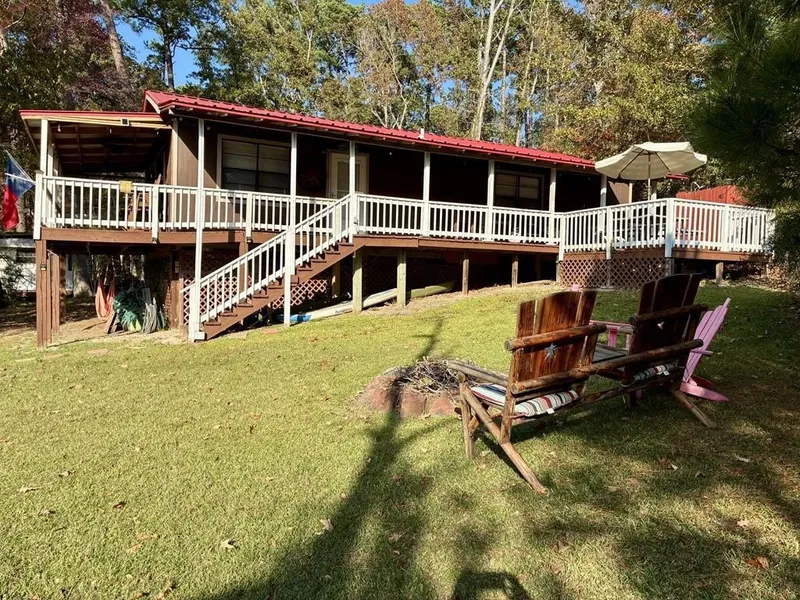 Enjoy a beautiful lake view from multiple outdoor seating areas, including six captain's chairs positioned along a spacious 180-degree porch (red roof shown in featured photo). The nicely sized yard includes a fire pit, offering an inviting space for evening gatherings. The property backs to a national forest, providing added privacy for the convenient outdoor shower area. Inside, the home is fully stocked with kitchen essentials and features a dedicated coffee bar. All furnishings may convey with a reasonable offer, creating a turnkey opportunity. Community amenities include a private boat launch for easy lake access and a refreshing pool for warm summer days.