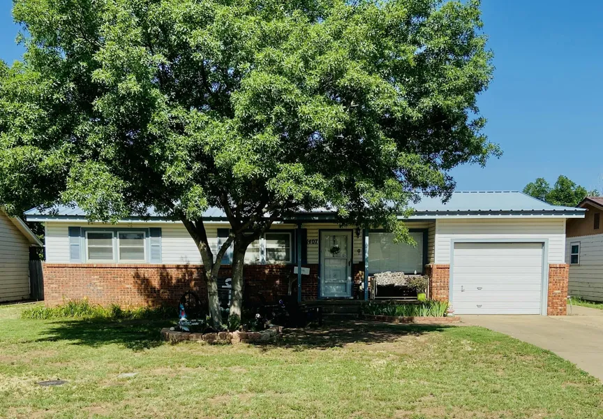 Charming 3 bedroom, 1 bath home with some updated fixtures. This home features a cozy front porch and a single-car garage. The open kitchen and dining area includes a breakfast bar and charming built-in hutch. The spacious utility room offers extra storage, plus hallway storage making organizing easy. Step out back to a spacious, shaded yard with a covered patio and a classic red barn-style shed. Just a short walk to the park, splash pad and 16th St. city pool conveniently located and move in ready.