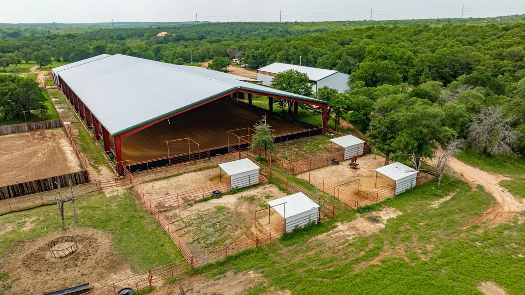 Description: Only an hour and fifteen minutes to Will Rogers Memorial Center in Ft Worth, this turn-key facility lies on 281.5 acres. The 275x125 arena stands as the crown jewel, equipped with a sprinkler system and roping chutes that seamlessly transition to a cowhorse arena. The attached show barn boasts 14 stalls with runs that effortlessly transform into 28 stalls with a simple adjustment of a gate. Just behind the covered arena is a 125x125 cutting pen complete with cattle holding pens, ensuring efficiency in your day to day. Ten holding pens are located behind the arena with an alley system. Attached to the arena is an expansive office with a full kitchen, half bath, and above the office is a two bedroom apartment. The main home features four bedrooms, 3.5 bathrooms, an office and game room. Just off the master suite, the balcony overlooks the pool and outdoor kitchen area. An insulated shop with power, water, and an apartment is one of 3 additional living quarters. All of this and more!