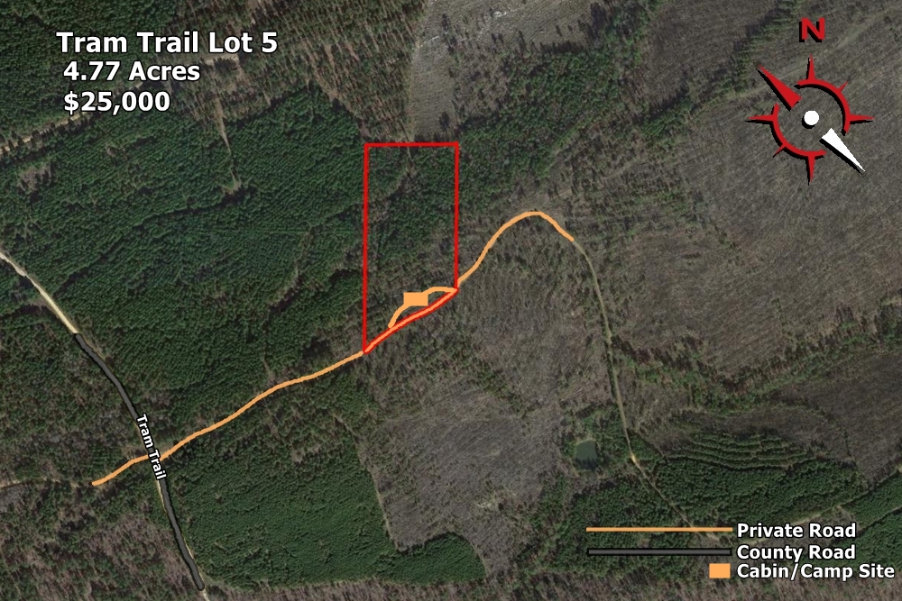 Tram Trail 5 is a 4.77 acre property featuring a nice mixture of pine and hardwood forest. Access is assured via Tram Trail a county maintained road running to the property. In addition a private road forms the Southern boundary of this mountain property. Whether you're looking for a weekend get a way, a place to build an off grid vacation cabin, or a bug out location from the city, this property will satisfy most of your requirements. An entrance and cabin / camp site has been cleared!