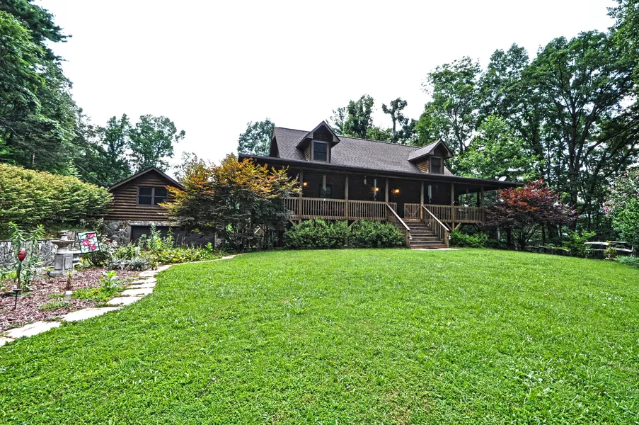 Tranquil and Private 62+ acres on pristine woodland with cascading creek. Beautiful 3BR/3.5BA log home with spacious, open floor plan, beautiful stone fireplace. Catch the mountain breezes from the large wrap around porches overlooking established gardens with multiple sitting areas. Great kitchen opens to living area and outdoor dining porch. Large sunroom. Master suite on main, 2 car detached garage. Shop, studio/rec room, guest cabin with hot tub.