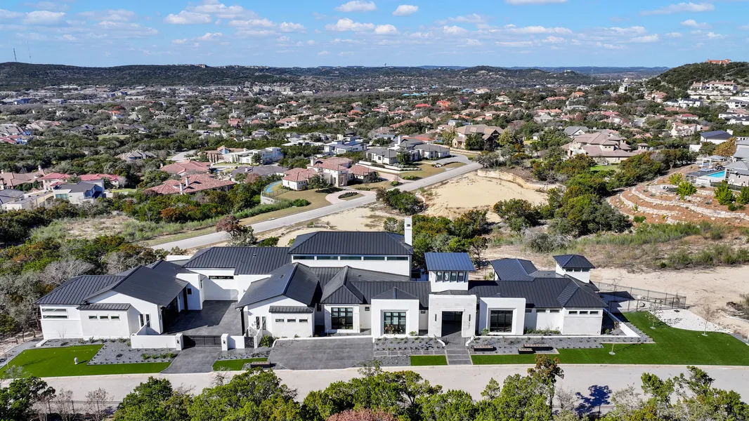 A striking transitional estate positioned along an exclusive cul-de-sac street within The Dominion, offering spectacular panoramic views and exceptional privacy. Walls of floor-to-ceiling glass fill the interiors with natural light, accentuating the home's remarkable craftsmanship and curated finishes. Designed on an impressive scale with soaring ceilings and verdant vistas, the interior showcases European white oak floors, smooth-finish walls, architectural ceiling details, designer lighting, and exquisite stone and marble selections throughout. The chef's kitchen features professional-grade stainless steel appliances and an oversized island that opens seamlessly to the family room, where soaring two-story ceilings and a stone-clad gas fireplace create an atmosphere of grandeur and warmth. The primary suite is a true sanctuary, offering patio access for morning coffee or evening relaxation, dual spa-like baths with separate vanities, and two custom-fitted closets with glass display cabinetry. Three spacious guest bedrooms each feature en-suite baths, while an expansive game room with a full wet bar provides an ideal setting for entertaining. Outdoors, a large covered patio with a full kitchen overlooks the resort-style pool and spa framed by sweeping Hill Country views. A four-car side-entry garage with epoxy-finished floors is complemented by an additional two-car garage and generous guest parking. Every element of this residence reflects thoughtful design and timeless luxury.