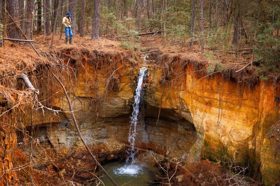 Defined by elevation changes rarely found in this part of the county, Treaty Springs unfolds across a series of ridges, valleys, and spring-fed drainages that give the land constant visual interest and depth. Towering native hardwoods and planted pine have been carefully managed to enhance wildlife habitat while preserving long sight lines and scenic beauty throughout the ranch. Live creeks traverse the property, a natural 30-foot waterfall cascades through iron-rich terrain, and a newly constructed 17 acre spring-fed lake rests between two of the ranch's highest points-creating a centerpiece that feels both intentional and timeless.