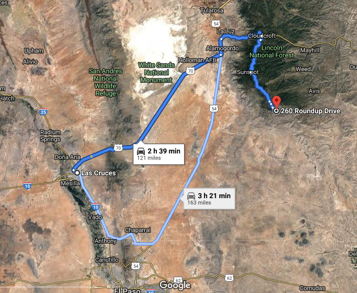 coordinates: 32.6105 N 105.6630 W (Road Corner), 32.6104 N 105.6633 W (Road), 32.6101 N 105.6621 W (Road), 32.6098 N 105.6630 W