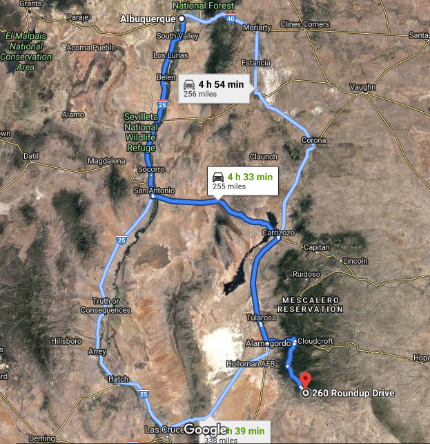 coordinates: 32.6105 N 105.6630 W (Road Corner), 32.6104 N 105.6633 W (Road), 32.6101 N 105.6621 W (Road), 32.6098 N 105.6630 W