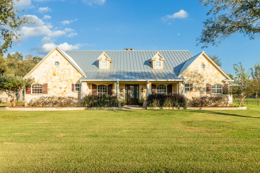 At Triple H Oaks, a picturesque oak lined driveway leads to a stunning custom 6,079 sqft home. Surrounded by lush grazing pastures, this Hill Country style home showcases exceptional architectural design and superior craftsmanship. Meticulously landscaped grounds and an abundance of native trees offer a tranquil haven only 30 miles from downtown Houston. The estate spans 23.13 unrestricted acres, lending itself to a variety of agriculture and commercial opportunities.