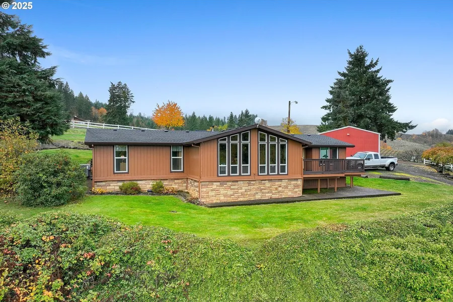 Perched on over thirteen pristine acres, this private retreat captures sweeping valley vistas crowned by the snow-tipped beauty of Mt. Hood. Designed for those who dream of space, serenity, and the rhythm of hooves at sunrise, this property welcomes both horse and rider. The 1,788-square-foot, two-bedroom, two-bath manufactured home offers comfort and light, with thoughtful updates including a brand new primary bath, new 2year old roof, hot water heater (2022), and HVAC with air conditioning (2018). But the true centerpiece lies beyond the home — an expansive horse barn and arena, ready to house your equine companions and elevate your riding experience. With an excellent producing well and open acreage perfectly suited for pastures, this property invites a lifestyle where horses hearts are content and the horizon feels endless. Bring your horses — and your heart — to this exceptional cou...