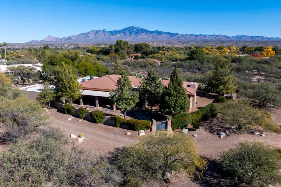 Welcome to this impeccably maintained home located in the beautiful and tranquil Tubac Country Club Estates. From the moment you arrive, you are greeted by a charming gated courtyard and welcoming entryway that set the tone for the comfort and quality found throughout the home. Step inside to an open and spacious living room featuring high ceilings with striking overhead beams, recessed lighting, and large neutral tile floors that create a bright and airy atmosphere. A cozy fireplace anchors the space, while a sunken bar adds a perfect spot for entertaining and gathering with friends and family. The open kitchen is both functional and inviting, highlighted by a large picture window over the sink that frames serene views of the patio and surrounding mountains, allowing natural light and nature to flow in. The kitchen boasts gorgeous granite countertops, a large butcher block island ideal ...