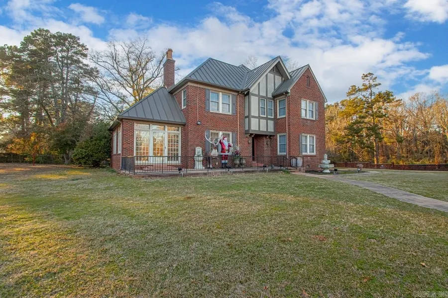 Exquisite two-story Tudor home with a rare blend of timeless charm and updated conveniences. Featuring 3 bedrooms, 3 baths, formal dining and spacious living room, a cozy den, and 2 offices/ sunroom. This historic home has Anderson windows, an updated kitchen, gas fireplace & original hardwood floors that exude warmth and character. The high ceilings and intricate trim details further enhance the old-world charm of this remarkable property.. It also includes a 2 car garage, basement, and separate mother-in-law quarters/guest house, all set on 6 acres. This property has endless possibilities! This is your opportunity to own a piece of history, complemented by elegant architectural details and the serenity of expansive acreage. The guest house is 780 sq ft 1 bedroom 1 bath. New metal standing seam roof 2019