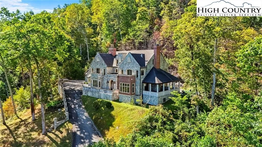 The Castle at Valle Crucis: This extraordinary compound features the rare assemblage of over 15 acres near the heart of the desirable Valle Crucis community, with a unique and majestic English Manor home with long-range, layered views of the surrounding Blue Ridge Mountains and pastures of Valle Crucis. Designed as a true replica of a Manor in Great Britain by William McLaughren, this one-of-a-kind estate features stone and building materials from around the world, as well as antique features and furnishings such as 17th to 19th century fireplaces, 500+ year-old arched entry doors from an English church, and even a chandelier imported from Princeton University, among others - see features list for more details on this unique offering. Resting at an elevation of over 3,400 feet, the property overlooks Grandfather Mountain and Howard's Knob, but features access off a paved, state-maintained road and is just 15 minutes from Boone, Banner Elk, and ski slopes at Sugar Mountain. With an impressive rental history, this home is offered fully furnished while in an established rental program, providing incredible investment potential, but would also make for a perfect mountain getaway or full-time residence. From the stone patio at the front of the home, step into the formal foyer with 24-foot soaring ceilings, adjacent to the large Great Room with a stone fireplace, antique chandeliers, and access to a covered stone patio- also with a fireplace and offering a hot tub & long-range, layered views. The chef's kitchen, also with a fireplace, offers granite counters, high-end stainless steel appliances, a dining area, and a walk-in pantry, and is adjacent to a sunroom/observatory with vaulted ceilings and a spacious laundry room with access to the oversized, two-car attached garage. The walk-in level also features a library and billiards room able to house 1,800 books (and with a plaster tracery ceiling imported from Great Britain), a formal dining room, a half bath, and a bedroom with an ensuite bathroom (one-level living!). Upstairs, the primary suite offers a private stone balcony, fireplace, walk-in closet, and bathroom with dual vanities, a soaking tub, and a tiled shower. Four additional suites exist on the second level (one also with a private stone balcony, and two being a Jack-n-Jill suite connected by one bathroom). Mahogany doors throughout were imported from England and are over 100 years old, adding antique charm, while modern amenities like an elevator to the first and second levels offer comfort and convenience. Upstairs, on the third level, find a spacious living room with game tables, a theater area, and an exercise area, along with a half bath. Additional amenities: 12-foot ceilings throughout, whole-house generator, interior & exterior sound system, water filtration system, whole-house generator, air scrubber & UV light for HVAC system. The existing driveway is fairly steep and winding; the seller is in the process of starting construction on a new portion of the driveway to eliminate the steepest turns.