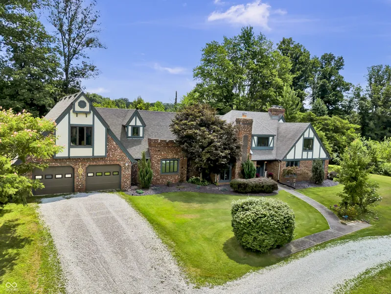 Discover the charm and grandeur of this stunning English Tudor Revival estate inspired by 16th century architecture, perfectly situated on 8 peaceful acres of gently rolling landscape. With 4,286 square feet of beautifully crafted living space, this one-of-a-kind home offers the perfect blend of historic character and modern comfort. The exterior showcases classic Tudor architecture - steep gables, decorative half-timbering, and rich brickwork - set against a backdrop of mature trees, fruit-bearing peach, plum, persimmon, apple, and pear trees, plus lush blackberry bushes. Inside, the home features four spacious bedrooms, two full bathrooms, five fireplaces, a wood-burning stove, and elegant architectural details throughout, including a beautiful wood staircase and tall ceilings that make each room feel grand and inviting. Enjoy a spa-like bathroom with a jacuzzi tub and gas fireplace for ambiance. The large kitchen boasts a center island, stainless steel appliances, and opens to a covered back patio, while the primary suite includes a private rooftop patio. A spacious parlor with fireplace and built-in bar is perfect for entertaining, and the main level large laundry room adds convenience. The oversized two-car attached garage includes a large loft space that could easily be finished for additional living area. A barn and outbuilding add to the property's versatility, and the circular gravel drive enhances the estate feel. Whether you're hosting gatherings or enjoying peaceful country living, this architectural gem offers unmatched space, style, and serenity.