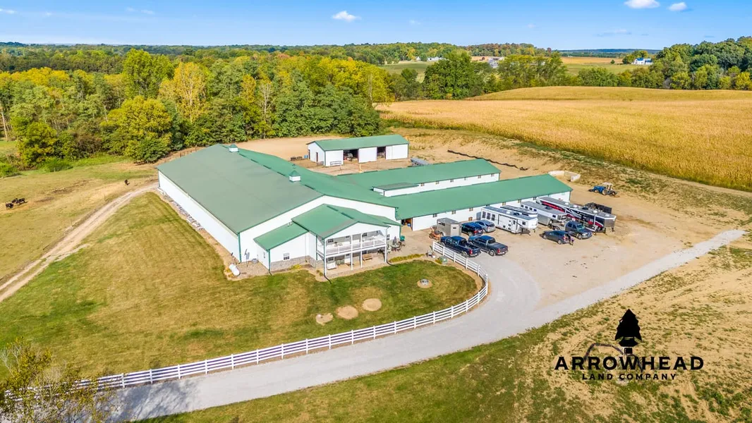 Welcome to Knox County and to this turn-key commercial horse arena, boarding, and training facility which is situated on +/- 7 spacious acres. Located about 50 +/- minutes from Columbus, Ohio, about 50 +/- minutes to Zanesville, and just about 15 +/- minutes to Mount Vernon sits this one of a kind business opportunity. Surrounded by wonderful views and just far enough from big city life, you will find multiple buildings that are set up and ready to board, train, and give a horse its best life possible. The main arena is a massive 80’ x 160’ foot facility, 12,800 sq feet, with a metal roof and 4 ft centers. There is plenty of lighting, including some LED lightning. Attached to the arena is an awesome, second level viewing/lounge area with large open glass windows to view the horses and riders in action. You and your guests/clients will really appreciate what the lounge offers as it can be...